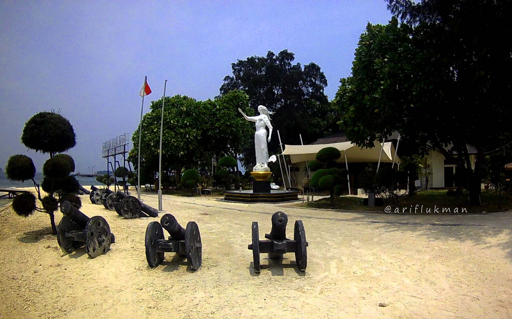 Setelah menempuh sekitar 20 menit perjalanan laut, pasir pantai yang putih mulai terlihat di depan pelupuk mata. Speed boat pun merapat di dermaga kayu, dan seketika terlihat patung wanita berwarna putih berdiri anggun di atas deretan meriam khas masa kolonial di bawahnya.