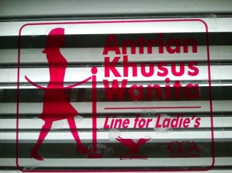 "Maaf, Pak, bisa tolong pindah ke barisan di sana? Ini kan antrian khusus wanita," kata saya sambil menunjukkan stiker pink yang tertempel di kaca halte, "bertuliskan Ladie's Area".