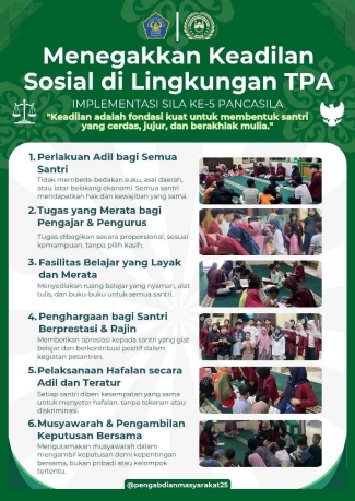 Nilai keadilan sosial sangat terasa dalam cara TPA Ummu Umar memperlakukan para santrinya. Semua anak diberi kesempatan yang sama untuk belajar, tanpa memandang latar belakang atau kemampuan masing-masing. Mahasiswa yang terlibat juga ikut mengamati dan berpartisipasi langsung dalam proses pembelajaran, melihat bagaimana lingkungan pendidikan yang adil dapat membentuk karakter anak sejak dini.