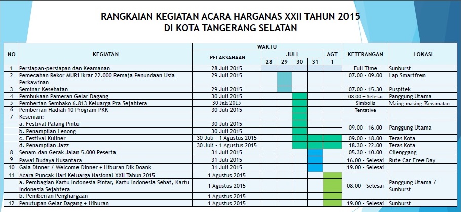 Tak kalah serunya, pada 30 Juli 2015 akan diadakan Pameran dan Gelar Dagang Produk UPPKS, Pameran Pembangunan, Pameran Batu Mulia Nusantara, Pasar Rakyat, Festival Anggrek dan Pengukuhan Pengurus Anggrek Seluruh Indonesia (pantas saja saya temukan ada gambar bunga anggrek yang tersemat cantik mewarnai logo acara Harganas ke-22 ini, ternyata anggrek ini icon kota TangSel tho...), Hiburan Rakyat, Penyerahan Hadiah untuk Juara-Juara Lomba, Bakti Sosial Pelayanan KB (IUD, Implant, Vasektomi, Pap Smear, Khitanan Massal), Festival Palang Pintu, Festival Kuliner, Penampilan Jazz. Lalu pada 31 Juli ada acara Senam Keluarga Indonesia dan Gerak Jalan 5.000 peserta, Pawai Budaya Nusantara, dan Gala Dinner. Bu Airin juga mengharapkan agar Harganas yang diadakan di TangSel ini bisa sukses dalam penyelenggaraannya, sukses dalam prestasinya, sukses juga dalam pengelolaan keuangan, sukses ketika acara puncak, sukses dalam penyambutan tamu yang baik, dan sukses pula dalam pertanggungjawaban anggaran.