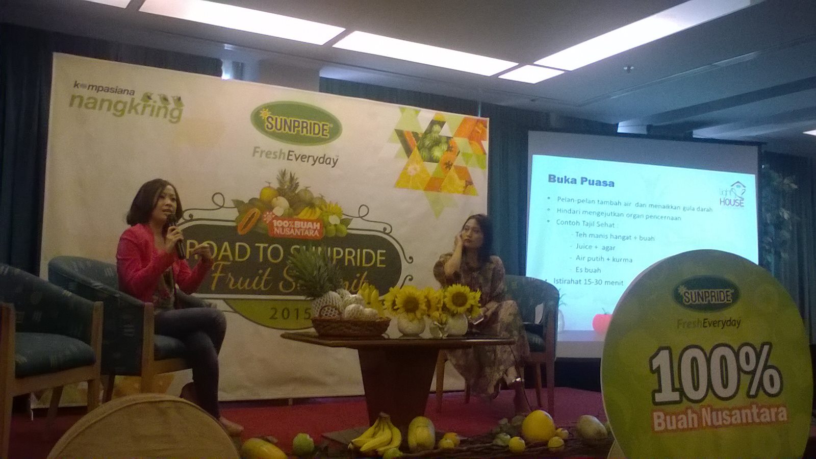 Mas Iyos memulai dengan menyilakan kompasianers untuk mengikuti livetweet dan instapic competition. Kompasianers duduk melingkari meja-meja menghadap panggung. Moderator kali ini adalah mbak Wardah Fajri, dengan narasumber dokter Grace yang ahli diet, dan ibu Luthfi sebagai Marketing dan Communication Manager Sunpride.