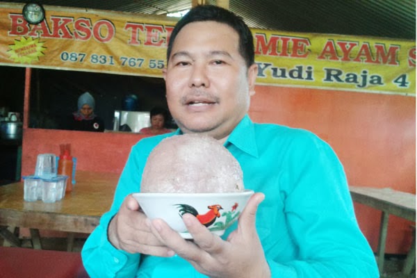 Jepara - Jika anda menikmati bakso , gelondongannya paling besar ya sebesar bola tenes. Namun di warung bakso “ Radja “ ada gelondongan bakso super raksasa. Besarnya tidak tanggung-tanggung yaitu sebesar bola takrow plastic. Sehingga jika dimasukkan dalam mangkok biasa air dan kuahnya tidak muat saking besarnya gelondongan baksonya.