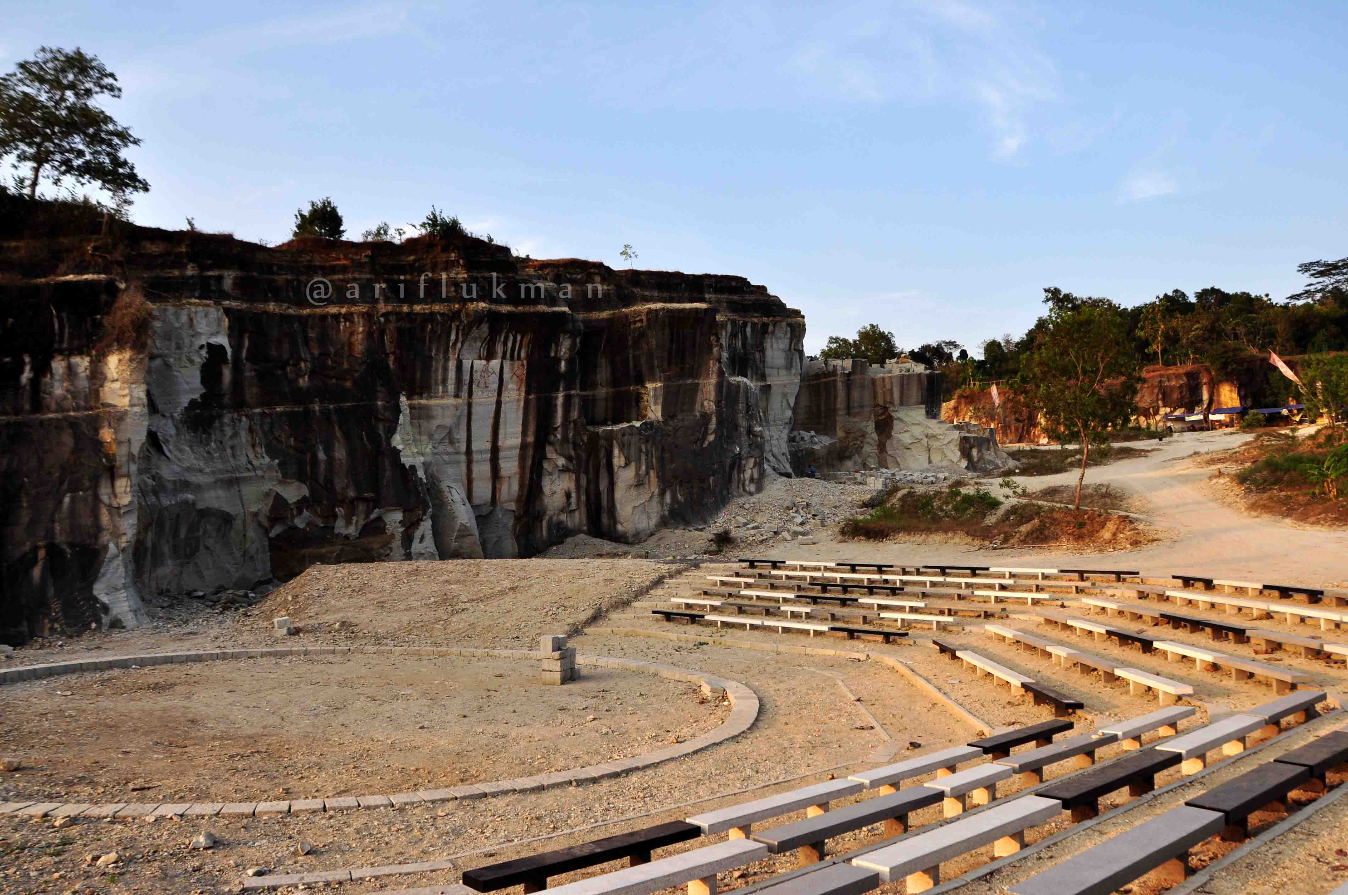 Pada bagian bawah tebing, kami melihat beberapa batu ditata menyerupai tempat duduk. Untuk apa ini? Kok mirip amphitheater? Rupanya inilah panggung terbuka yang dinamai ‘Tlatar Seneng’ yang bisa digunakan untuk aktivitas seni dan budaya.