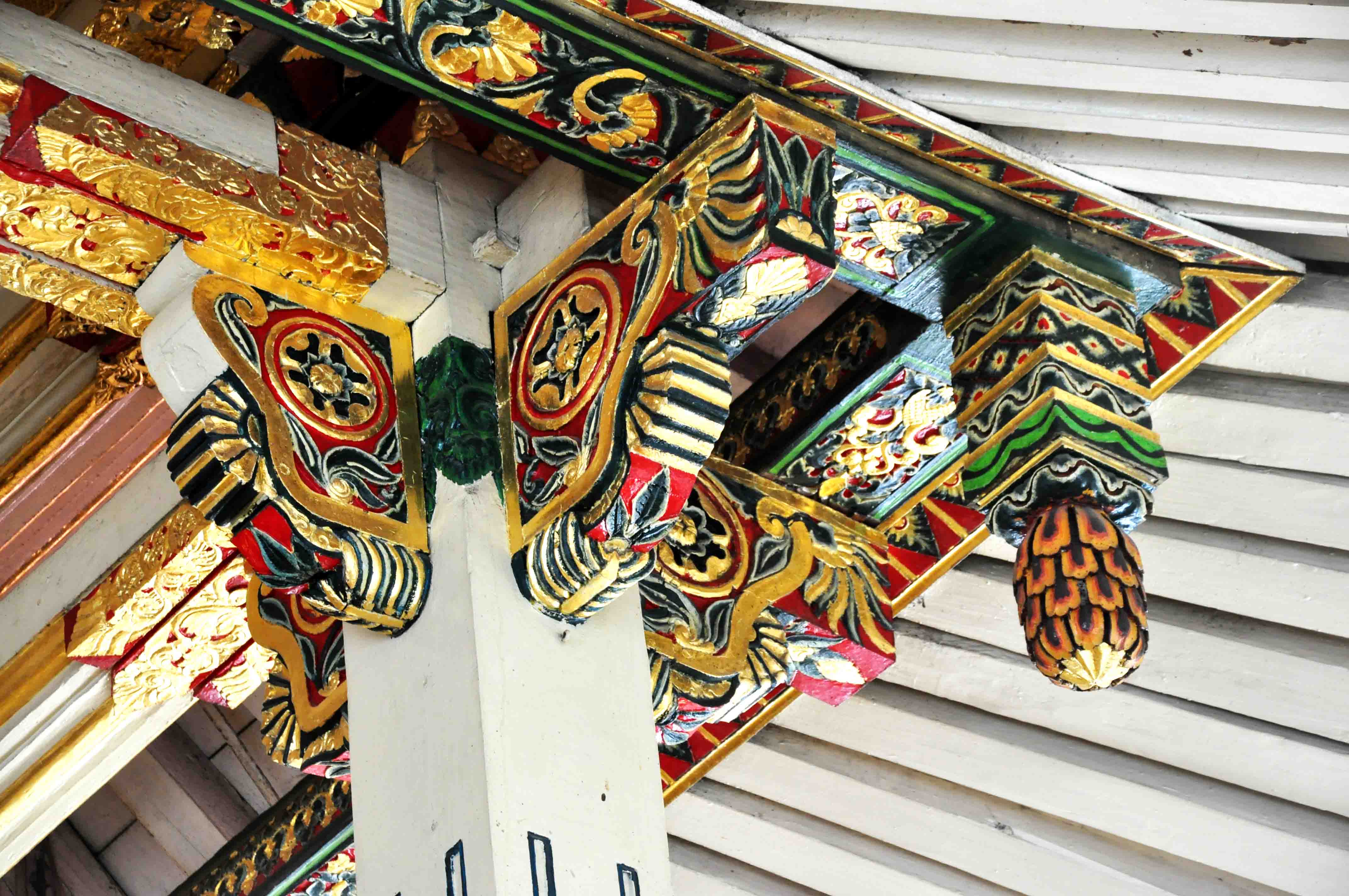 Berikutnya di bagian serambi depan masjid, kayu-kayu jati yang menyangga atap Masjid Gedhe diberi warna cerah dengan komposisi utama putih, emas, dan merah. Tiang-tiang di serambi ini menyangga atap yang juga tersusun dari kayu jati. Menariknya, setelah saya amati ternyata susunan kayu ini tanpa menggunakan paku untuk mengaitkan satu sama lain. Â