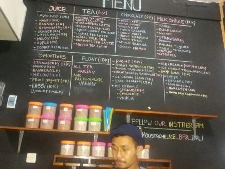 Satu lagi tempat nongkrong anak muda di Kota Denpasar, Bali yang menyajikan sesuatu yang berbeda dan juga bisa dijadikan alternatif untuk berkumpul bersama kawan atau bisa juga dijadikan tempat nongkrong para kawula muda. Nama lokasi yang baru dibuka awal Bulan September 2015 ini adalah Mustache Bar. Eits, walaupun namanya ada kata Bar tetapi disini tidak menjual minuman berakohol loh. Dengan mengusung tema santai dan homey, Bar yang terletak di Jalan Merpati Denpasar-Bali ini menyajikan menu segar berbahan es. Sebut saja sajian jus berbagai macam buah mulai alpukat, mangga, pisang, strawberry, jeruk, semangka, melon, apel dan tomat. Untuk menu jus segar dibandrol mulai harga Rp 8.000 s/d Rp 10.000 saja.