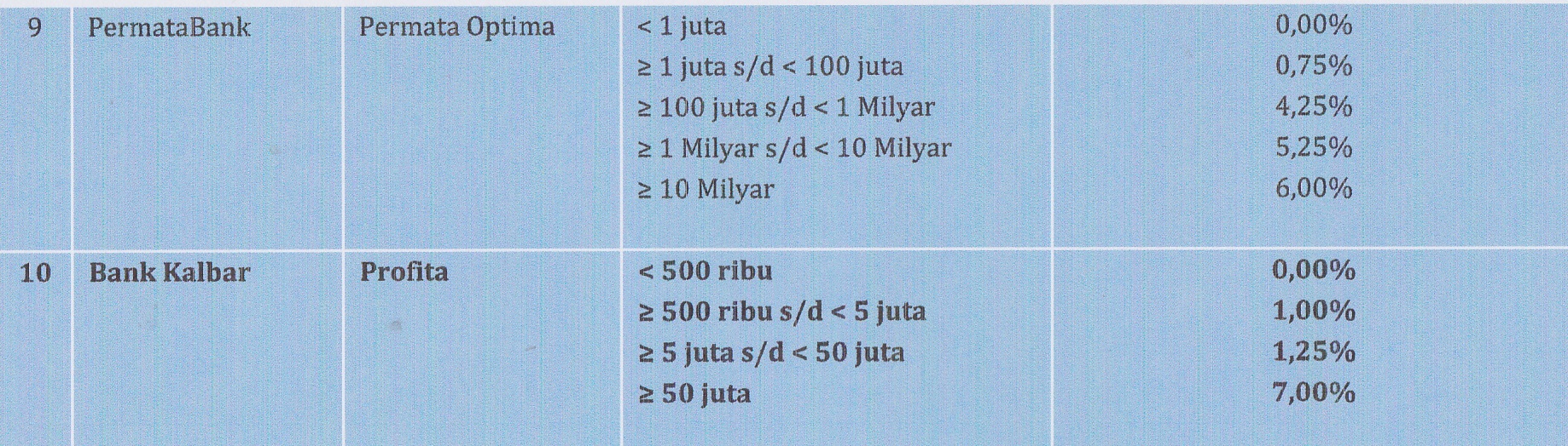 Berbeda dengan produk tabungan premium lainnya, Tabungan Profita dari Bank Kalbar memberikan hasil bunga yang lebih maksimal. Dengan saldo hanya Rp. 50 juta, tabungan ini sudah memberikan bunga sebesar 7,00% per tahun nya. Bahkan dengan saldo dibawah Rp. 50 juta, tabungan ini masih memberikan bunga yang cukup menarik. Hebatnya lagi, perhitungan bunga dilakukan secara threshold bukan secara tier-ing sehingga jika saldo telah mencapai di atas Rp. 50 juta, semua saldo langsung diberikan bunga sebesar 7,00% per tahun nya.