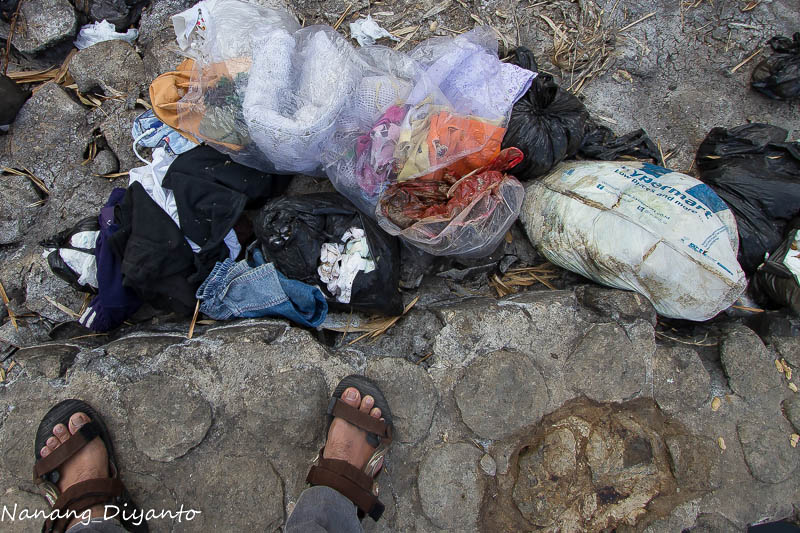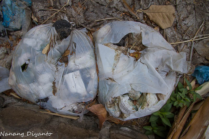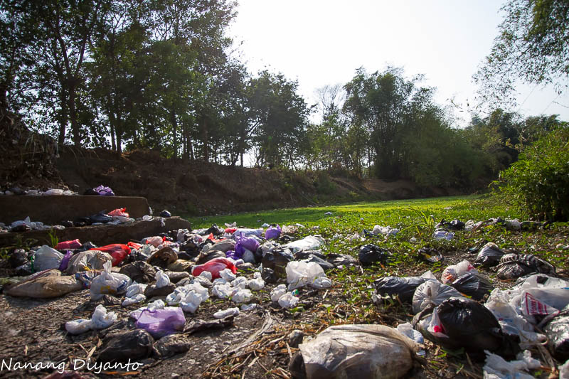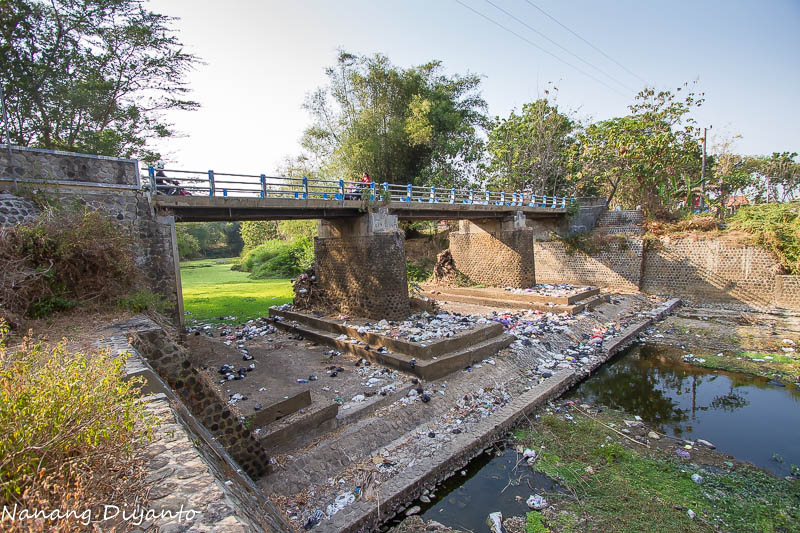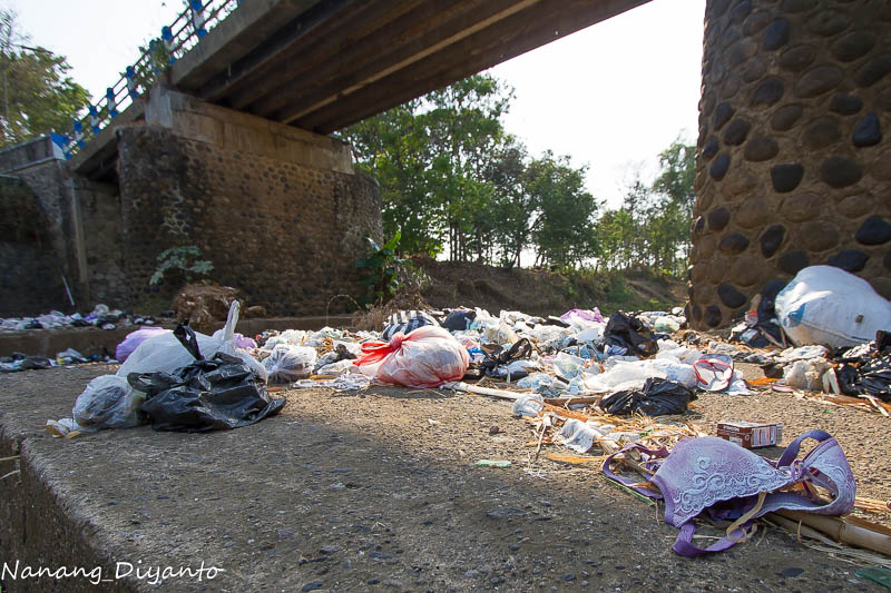 Awalnya biasa saja, tak mengusik hasrat saya untuk memotret meski saban hari 4-10an kali melintasi jembatan ini. Berkali-kali tadi pagi saya perhatikan banyak pengendara motor melemparkan bungkusan berupa tas kresek ke sungai dari jembatan sambil melintas. Begitu juga beberapa mobil memperlambat jalannya dan membuka jenda kaca mobilnya dan lagi-lagi melempar bungkusan plasti ke dasar sungai. Sayapun meminggirkan motor dan segera menuju ke sungai, jalanan curam memaksa harus hati-hati, bau busuk menyengat meski masih dibibir sungai sebelah atas, berkali-kali tenggorokan seperti dikorek, rasa pengin muntah akibat bau busuk dari dalam sungai, dan akhirnya saya melepas kaos yang saya pakai yang saya fungsikan sebagai masker untuk menutup hidung dan mulut.