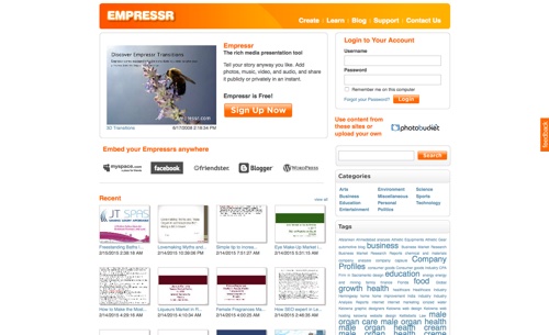 Empressr merupakan tool buat membentuk presentasi online dengan fitur yang lengkap. Kita dapat upload media assets sendiri seperti video, audio, gambar, dan animasi ke Empressr media library, atau bisa dengan import eksklusif dari Flickr, Google, Yahoo, dan Photobucket. Track siapa saja audiens yang berinteraksi dengan slide yang kita buat. Kita juga bisa masukan feedback langsung buat audiens selama presentasi. Harga: Free.