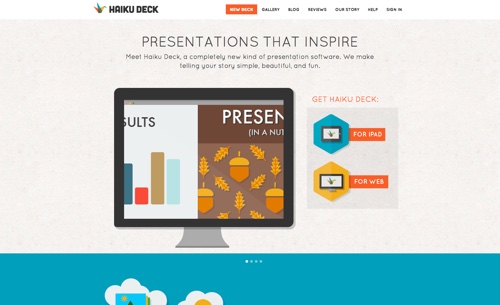 Haiku Deck artinya tool presentasi buat membentuk dan menyebarkan cerita dengan gambar high-impact dan desain yang bagus. Haiku Deck didukung dengan lebih dari 35 juta gambar gratis & 6 tema gratis. Kita juga bisa memakai gambar, diagram, atau grafik sendiri. Haiku Deck tersedia buat web atau iPad. Harga: Free. Buat tema & gambar premium dari Getty Images dapat kita peroleh dengan membelinya di iPad.