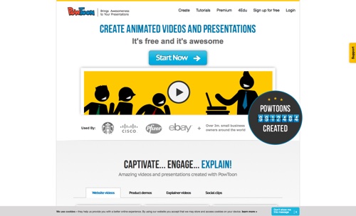 PowToon adalah pelaksanaan sederhana & user-friendly yang memungkinkan kita buat menghasilkan presentasi dengan animasi yang menarik. Menggunakan step-by-step interface untuk menghidupkan presentasi dengan karakter yang lebih bergerak maju, gambar, dan teks aktif berurutan. Harga: Free dengan watermark. Versi Pro $19/bulan.