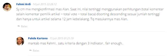 Pertanyaan saya mengenai bagaimana mekanisme terpilihnya tulisan raih "Nilai Tertinggi" akhirnya tercerahkan, setelah bung Fahmi Ardi selaku orang dalam Kompasiana menjelaskan dalam kolom komentar di artikel Alan Budiman, bahwa "Nilai Tertinggi" satu artikel di Kompasiana berdasarkan akumulasi perhitungan (total komentar selain komentar pemilik artikel + total vote + total baca) disorting descending. Jadi makin banyak orang lain yang membaca, berkomentar dan memberi vote dalam satu tulisan milik Kompasianer, maka makin besar peluang tulisan tersebut untuk menduduki peringkat teratas "Nilai Tertinggi".