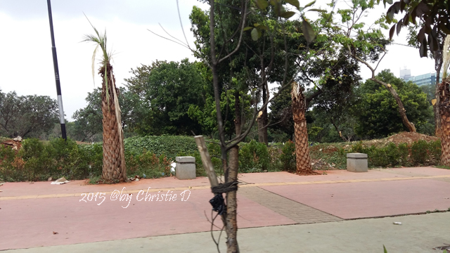 Pohon-pohon itu ditanam sudah cukup besar. Sekitar 2 meter tingginya. Tentunya dengan daun-daun yang sudah "jadi". Ketika baru ditanam dengan kayu-kayu untuk menahan agar pohon tidak miring atau jatuh, pertugan masih cukup rajin untuk menyiram dan merawatnya. Aku senang sekali, ketika aku melihat beberapa petugas menyiraminya dan merawatnya, ketika beberapa pohon sempat miring karena kayu penahan seperti nya tidak kuat.