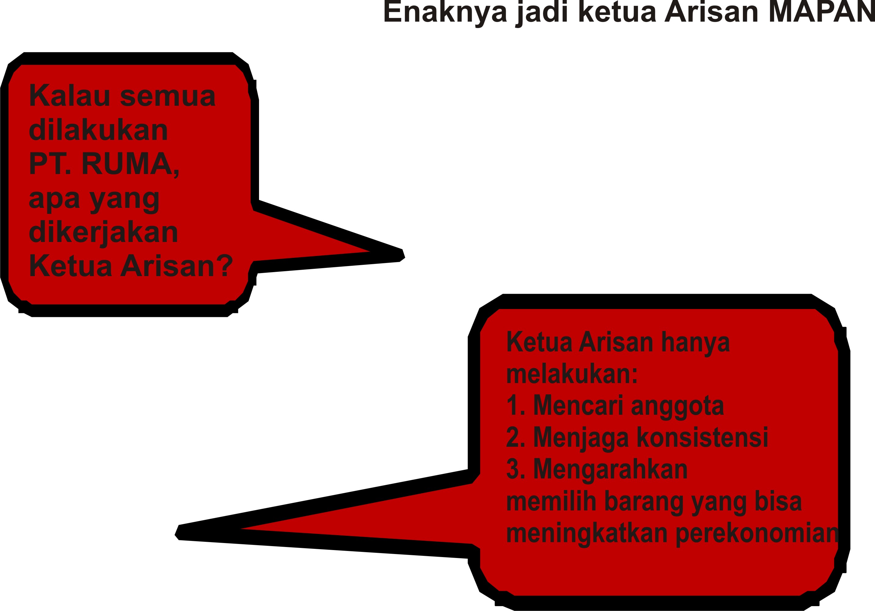 Selain, jika arisan tradisional ketua arisan biasanya dibantu sekretaris atau bendahara agar ada fungsi kontrol maka pada arisan MAPAN ada  PT. RUMA  sebagai pemodal, pengelola, penjamin dan pengontrol. Maka untuk sukses berjalan arisan baik arisan tradisional maupun arisan MAPAN adalah KREDIBILITAS, peserta arisan ketua arisan. Kembali pada tujuan dan niatnya. Kalau tujuan dan niatnya baik harusnya hasil akhirnya ya baik juga.