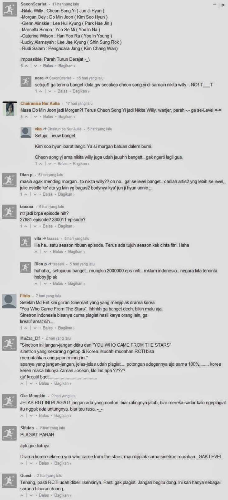Fans Nikita kelabakan. Itu belum termasuk komentar yang ada di Twitter, coba saja cari kata kunci "Kau yang Berasal dari Bintang". Tak terhitung sampai detik ini komentar hujatan netizen terkait sinetron itu. Namun, ada beberapa artikel dari situs berita online yang memuat bantahan kalau sinetron itu bukan plagiat.