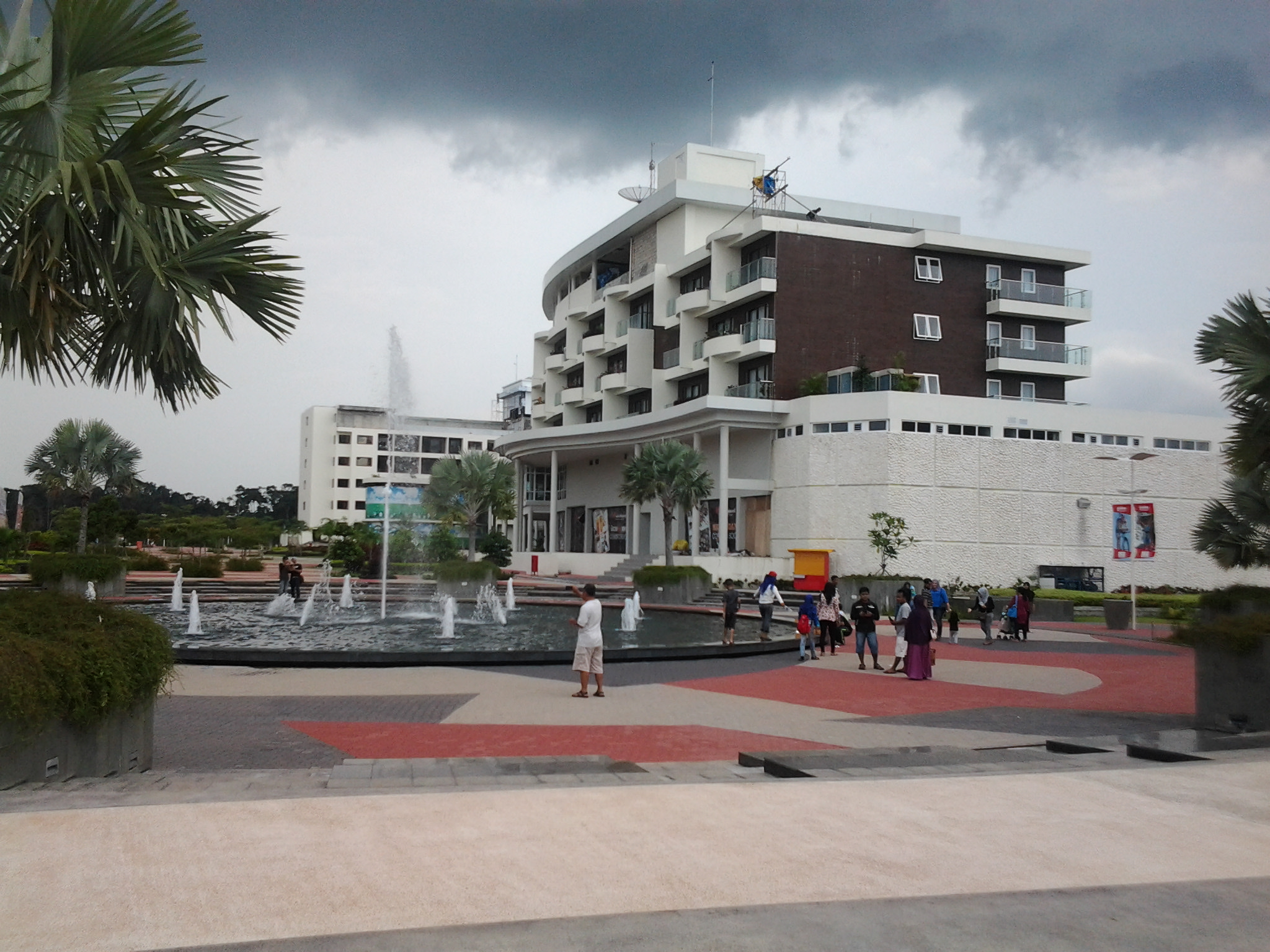 Atap bangunan di plaza ini sedikit mirip rumah adat toraja, lancip di depannya. Di tengah-tengahnya berupa taman terbuka beratapkan langit, yang dilengkapi dengan beberapa air pancur. Kami memasuki Restoran Idola, yang terletak di salah satu sudut kawasan plaza ini. Harga makanan disini memang cukup menguras kantong, bayangkan saja, teh tarik yang biasanya aku nikmati dengan harga paling mahal Rp. 10 ribu, tapi disini, Rp. 50 ribu per gelasnya! Tapi jangan khawatir, terdapat stan bazar aneka jajanan di sebelahnya, yang harganya merakyat. Namun hanya ada di saat weekend, hari Minggu.