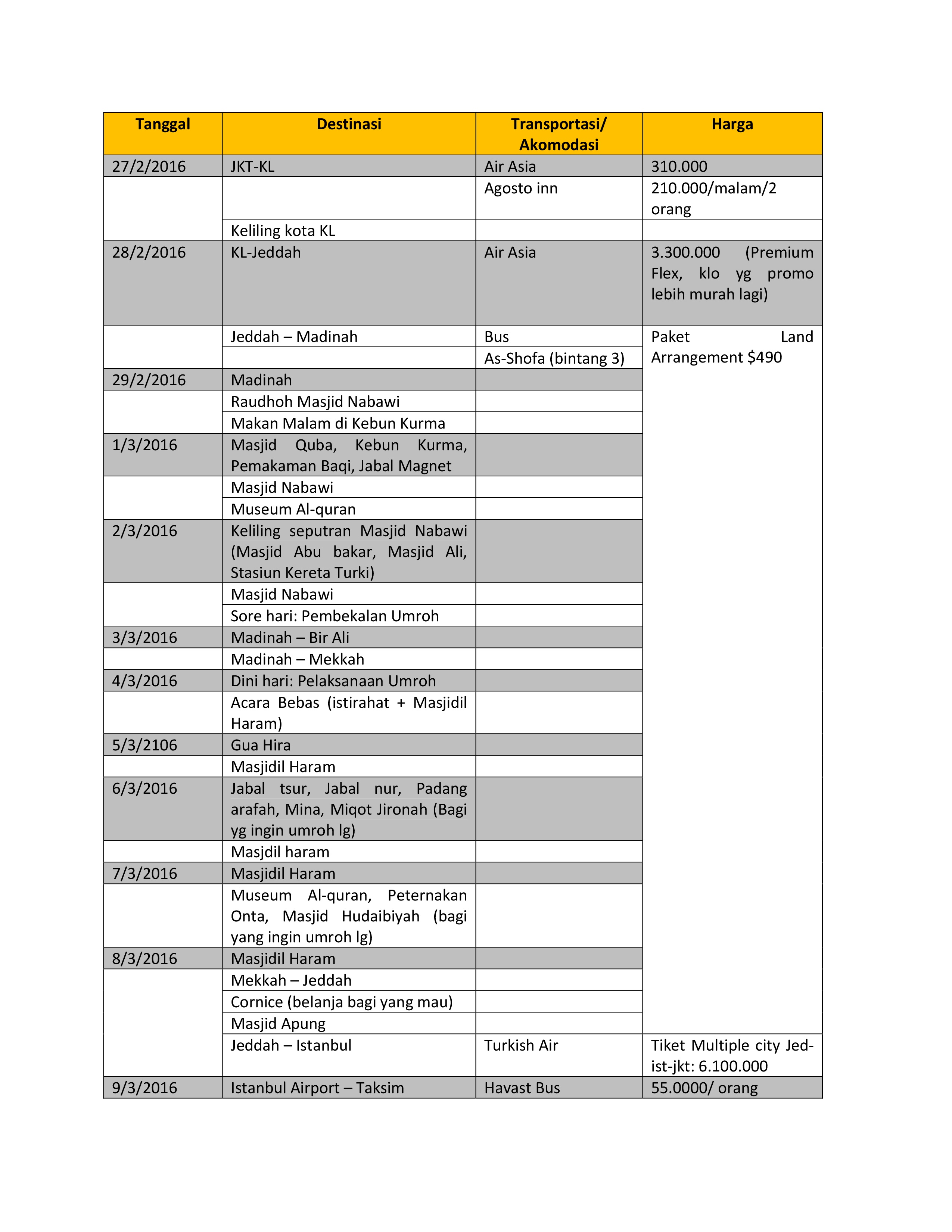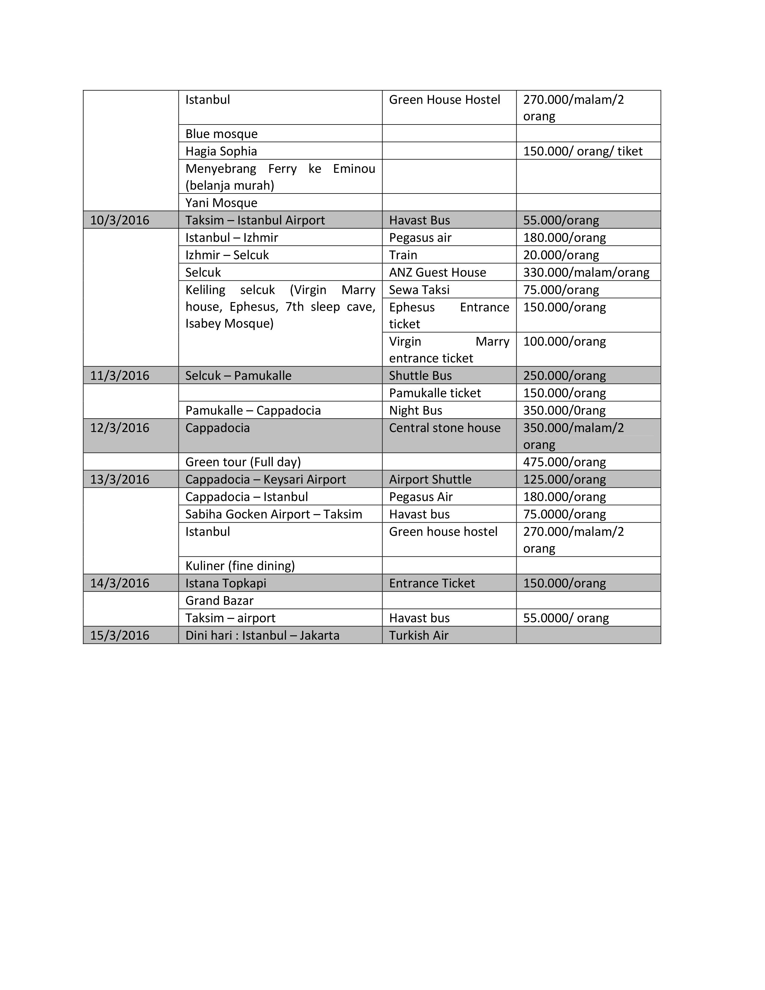 Nah kira-kira itu garis besar perbedaan antara umroh backpacker dan umroh reguler, menurut saya dari segi pelayanan tidak ada perbedaan yang signifikan dengan umroh reguler. Ibadah umroh tetap berjalan lancar dan nyaman. Sebagai penutup berikut saya berikan itinerary dan perkiraan budget selama perjalanan umroh + turki kemarin selama 18 hari. Tim umroh backpacker hanya mengatur perjalanan umroh saja sedangkan di Turki semuanya saya atur sendiri.