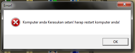 Contoh :Â x=msgbox("Komputer anda Kerasukan setan! harap restart komputer anda!","16","Error!") > Save As: Errrrorr.vbs