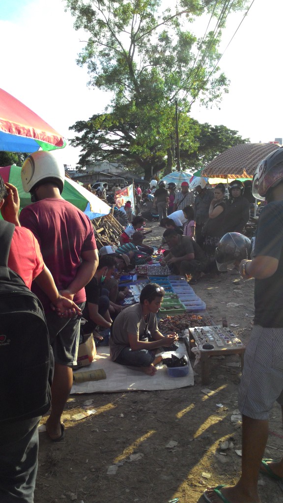 Pastinya di Pasar Akik Pinggiran ini dominan para laki-laki “pencinta” batu akik yang betah melihat-lihat bahkan menyenter-nyenter batu untuk melihat keaslian batu serta warna yang terpancar dari batu tersebut..