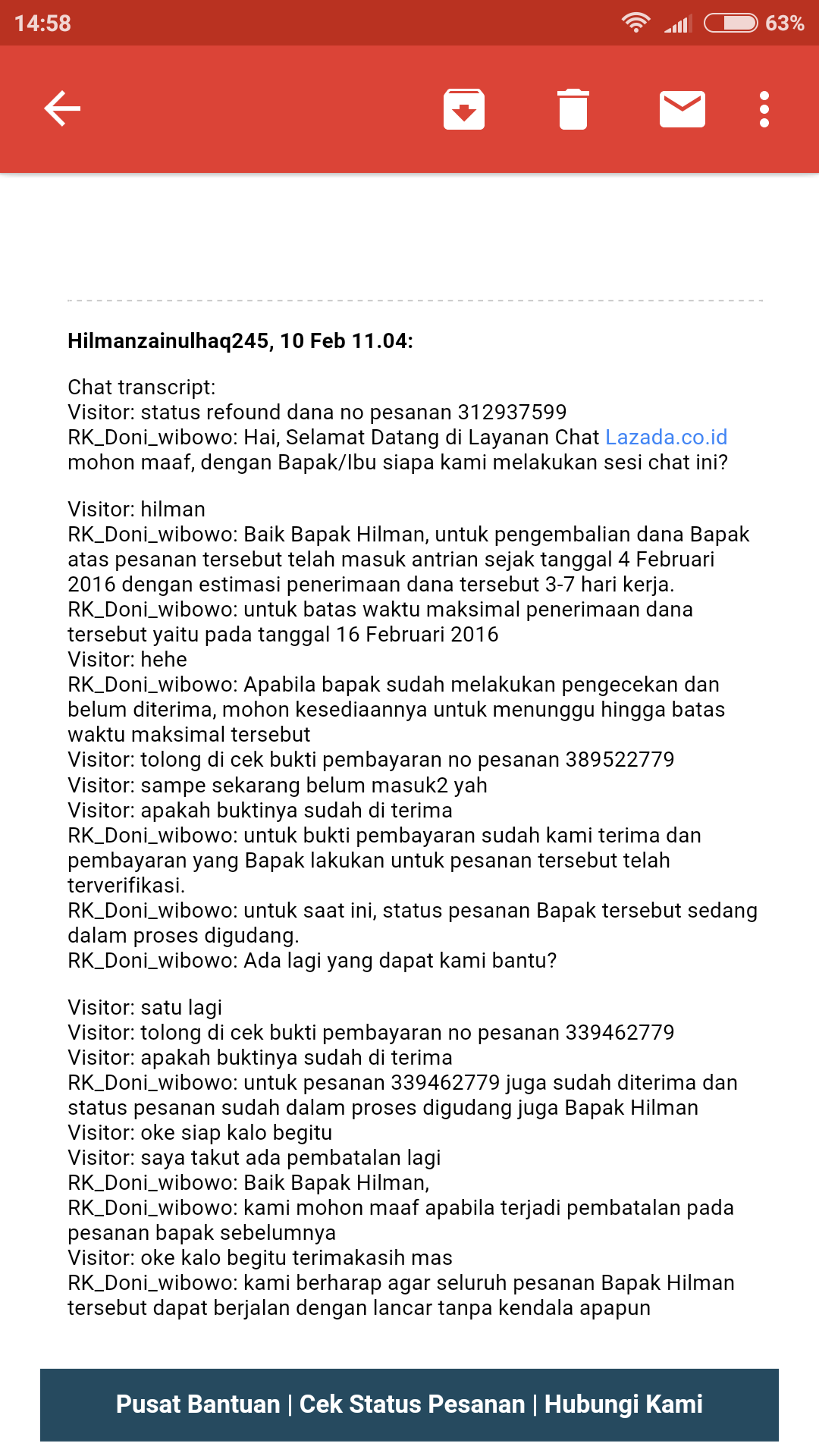 Lanjut kemudian saya mengirimkan bukti pembayaran melalui email ke suport@lazada.co.id dan pada tanggal 22 januari 2016 saya mendapatkan email balasan bahwa dana saya akan di refound  pada tanggal 4 februari 2016 dan akan jatuh tempo tanggal 16 februari 2016,, saya pun aga lega dan bersedia menunggu untuk proses refound tersebut.