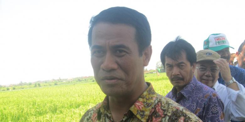 Menteri Pertanian RI, Andi Amran Sulaiman, saat meninjau areal sawah di Desa Cemagi, Kecamatan Mengwi. Pada kesempatan itu, Andi menyampaikan, tidak hanya irigasi yang akan dibangun pemerintah pusat, tapi juga akan disediakan bibit kedelai dan jagung untuk mengoptimalkan lahan agar dapat berproduksi dengan baik. Semua ini diharapkan dapat meningkatkan produksi pangan di Provinsi Bali hingga 20 persen. Foto: kompas.com