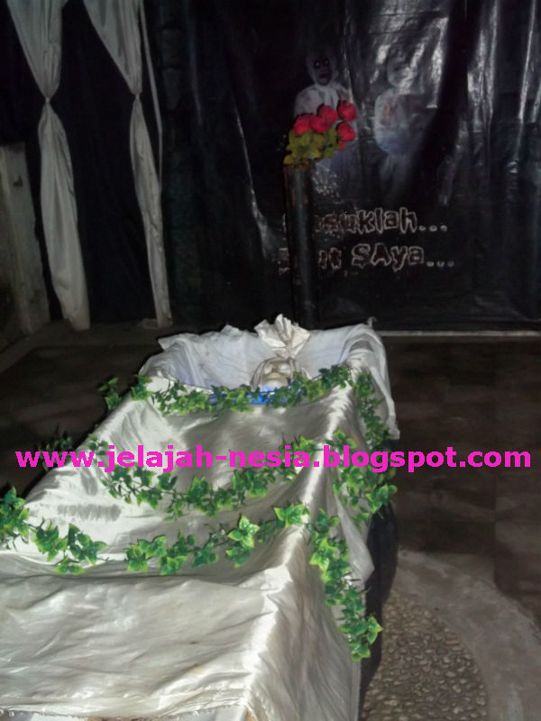 Berikutnya ada ornamen berupa tiruan peti mati dengan ada mayat di dalamnya. Ada juga ornamen berupa sosok hantu berwajah seram dengan penerang lampu berwarna birru.Melangkahkan kaki selanjutnya saya menjumpai ruangan yang sangat gelap. Ruangan terbuka ini hanya pepohonan dengan berpagar lembaran-lembaran kain berwarna hitam dan aneka ornamen yang berserakan.