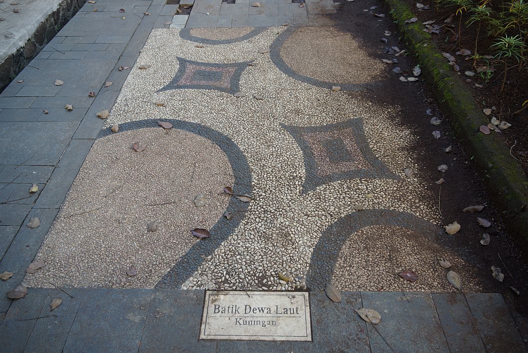 Mungkin heran yah .... depan Gedung Sate kan Gasibu, lalu tepatnya di mana nih ??? Jawabannya adalah TROTOAR persis depan Gedung Sate !!! Iya, trotoar tempat orang berjalan kaki, berseni yah .... Saya pun kebetulan saja ketika sedang jalan kaki menyusuri Bandung lihat ke bawah. Sambil jalan, bisa mengenal jenis-jenis corak batik khas dari berbagai daerah di Jawa Barat. Sayangnya, kotor dan warnanya sudah memudar. Untungnya, saya masih bisa baca penjelasannya.