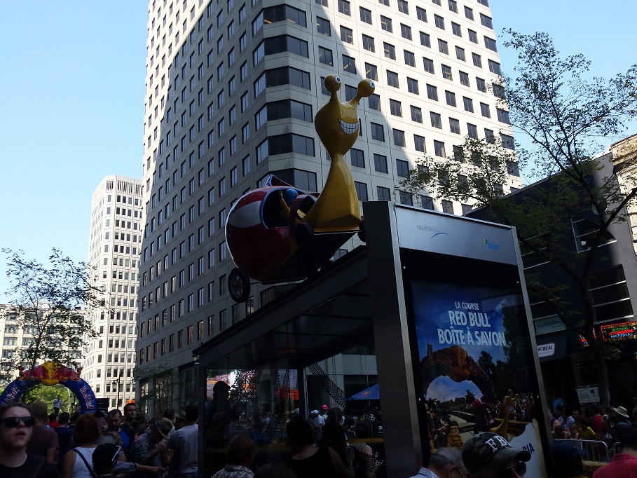 [caption caption="Maskot Soap Box Montreal 2015 di halte bus."]