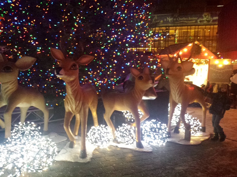 [caption caption="Rusa-rusa penarik kereta Santa di bawah giant Christmas tree ( sapin Noël)."]