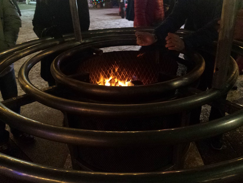 Di ujung jalan selewat pohon natal raksasa, terlihat beberapa orang sedang menghangatkan diri di perapian. Perapian ini masih menggunakan kayu bakar, sehingga asapnya terasa sekali bila menghadap tiupan angin. Rupanya ini meniru tradisi ratusan tahun lalu saat perayaan pasar Natal masih menggunakan pemanas dari kayu bakar. Namun, sebenarnya perapian ini juga bisa digunakan untuk memanggang makanan. Beberapa langkah kemudian terlihat panggung pementasan yang saat itu sudah sepi, dengan layar latar belakang led raksasa yang menampilkan informasi berganti-ganti. Kebetulan hari itu semua aktivitas hiburan telah berakhir, dan beberapa kios juga telah menutup tokonya karena turunnya salju.