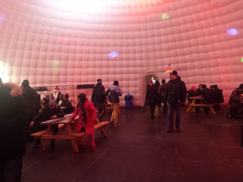 Melewati panggung hiburan, terlihat ada rumah igloo raksasa. Igloo merupakan rumah suku eskimo di kutub utara yang dibuat dari bongkahan es. Cuaca yang dingin di luar ruangan, terasa menjadi hangat begitu memasuki rumah igloo. Di dalam igloo terlihat ada banyak meja, dan ada beberapa permainan gratis yang disediakan. Tampak beberapa orang duduk bermain catur dan bermain kartu, ataupun sekedar mengobrol. Panitia juga menyediakan beberapa papan catur dan kartu permainan yang dapat diperoleh pengunjung bila ingin bermain. Tentunya cocok bagi Kompasianer pencinta catur. Keluar dari rumah igloo melalui pintu belakang, terlihat boneka-boneka Natal menyambut pengunjung.