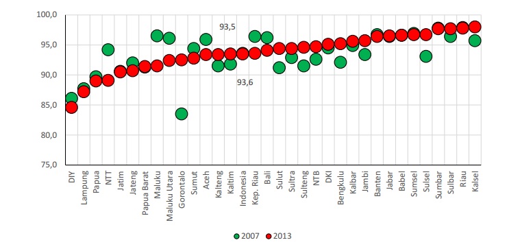 Menurut Riskesdas 2013, peduduk yang dikategorikan ‘cukup’ mengonsumsi sayur dan/ buah adalah minimal 5 porsi per hari selama 7 hari dalam seminggu. Setelah dilakukan analisis, diketahui terdapat kecederungan proporsi penduduk umur lebih dari 10 tahun kurang mengonsumsi sayur dan buah. Secara nasional tidak terjadi perubahan yang berarti di antara data 2007 dan 2013, hanya perubahan paling menonjol di Gorontalo dengan proporsi kurang makan sayur dan buah makin meningkat, dari 83, 5 persen menjadi 92,5 persen.