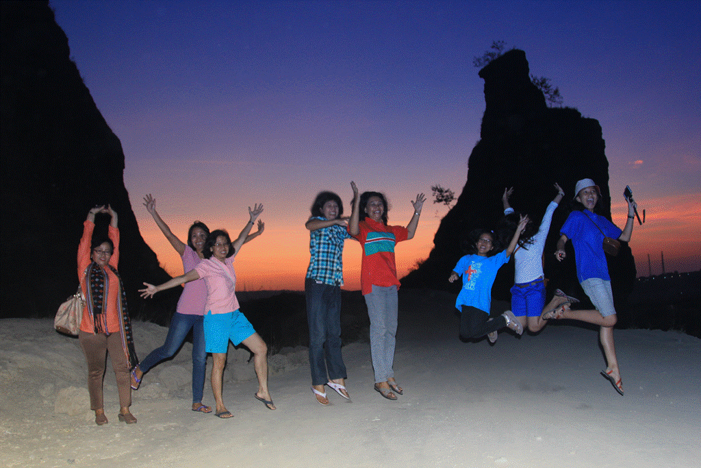 Saya datang ke lokasi sekitar jam 5 sore. Memang ada maksudnya saya dan rombongan datang pada sore itu. Kami akan menikmati matahari terbenam dari Brown Canyon dari sudut Timur. Dari sudut ini, gunung buatan tadi menjadi siluet dengan bentuknya yang unik. Tak hanya itu, beberapa pengunjung dengan kameranya masing-masing mengabadikan golden sunset itu dengan aneka macam gayanya.
