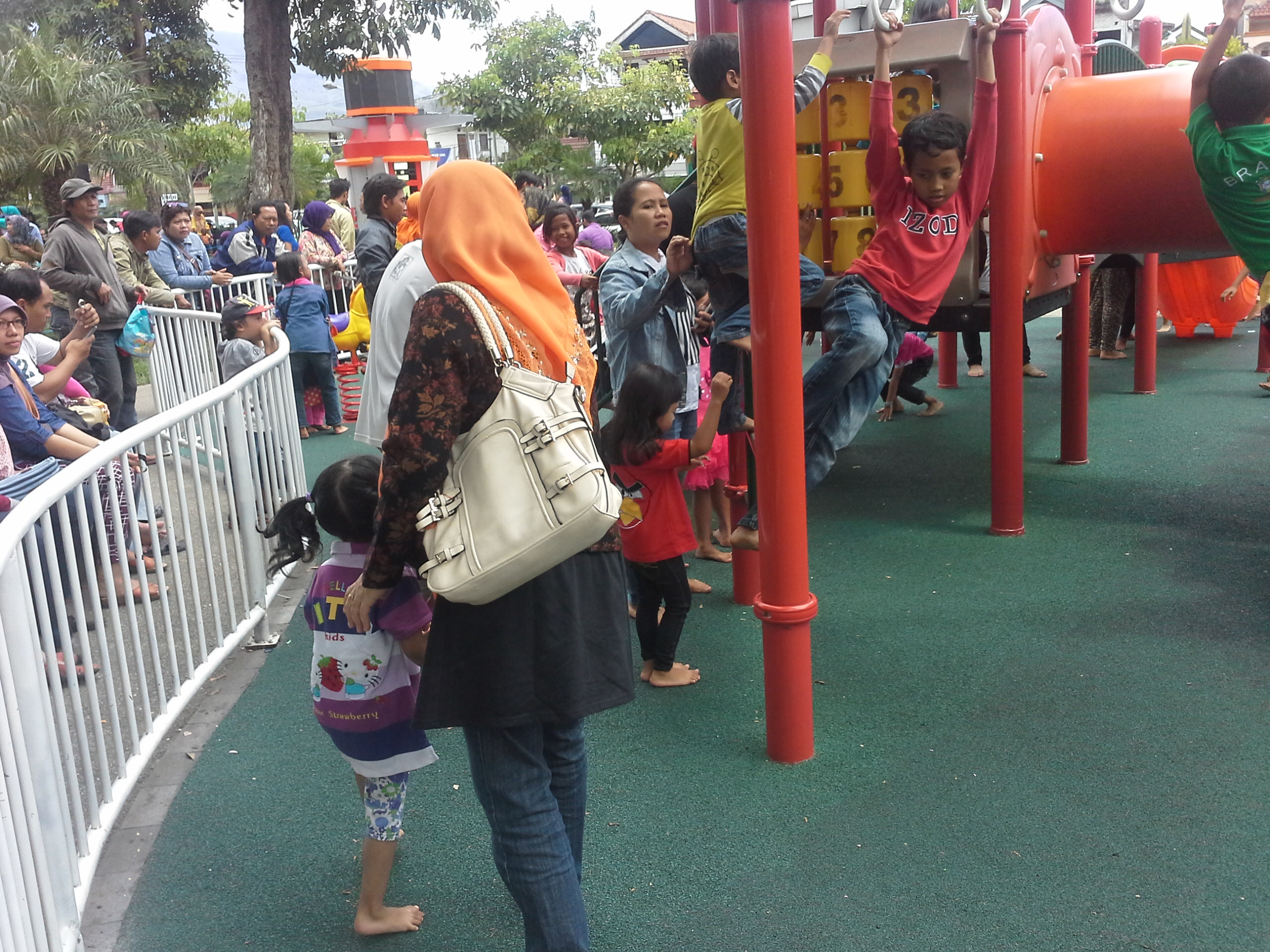Sementara di salah satu sudut taman lainnya, di pojok arah tenggara, sekelompok anak-anak terlihat riang gembira. Mereka asyik bermain plorotan, naik turun tangga, keluar masuk melewati mulut pipa mainan. Mereka asyik bermain dan berceloteh, sementara orang tuanya mengawasinya dari tepi taman. Area permainan itu cukup luas, diletakkan di bawah pohon rindang. Sambil mengawasi, sesekali ibu-ibu di sana mendekati anaknya yang masih kecil, untuk sekedar membantu anaknya menaiki tangga-tangga permainan plorotan.