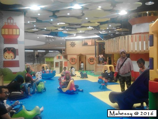 Melihat bahwa keamanan arena playground ini cukup membuat saya tenang, saya memilih untuk duduk rileks di lantai sambil memantau si Kakak lari-larian dan bermain bersama teman-teman yang baru dikenalnya. Pada saat duduk, saya melihat aneka toys yang ada di dekat saya. Ada kuda-kudaan, mobil-mobilan, pesawat, see-saw, perosotan mini, semua terlihat bersih, terawat dan masih dalam kondisi prima. Hal ini menunjukkan bahwa playground ini di-maintain dengan baik oleh manajemen. Sambil ajak si Dede main mobil, saya mendengar soundtrack yang diputar (dengan volume secukupnya) adalah album anak-anak milik Tasya dan Sherina. Ini memperkenalkan anak-anak saya terhadap lagu anak-anak yang jaman sekarang sudah jarang terdengar (si Kakak lebih hafal lagu-lagu Taylor Swift daripada ‘Anak Gembala’).