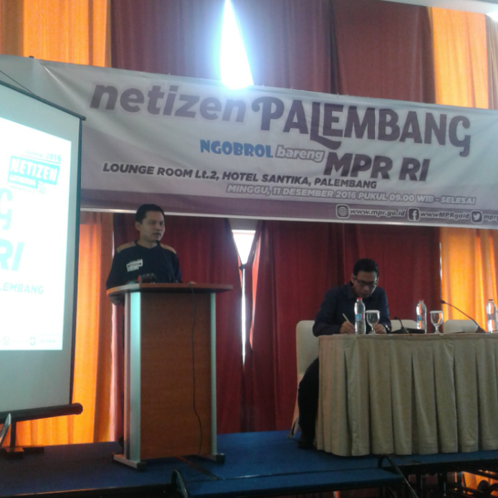 Suatu kehormatan dan kebanggaan tersendiri dapat bergabung dalam acara Minggu lalu, tepatnya tanggal 11 Desember 2016. Acara yang bertema “Netizen Palembang Ngobrol Bareng MPR RI” ini bertempat di salah satu hotel yang masih terbilang baru di Palembang, yakni Hotel Santika. Seperti acara-acara pada umumnya, pertama kali sebelum masuk ke ruangan tempat acara, para netizen diharuskan registrasi terlebih dahulu. Selesai registrasi, panitia memberikan tas keren berisi kaos, buku dan alat tulis.
