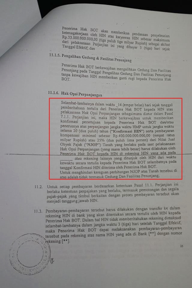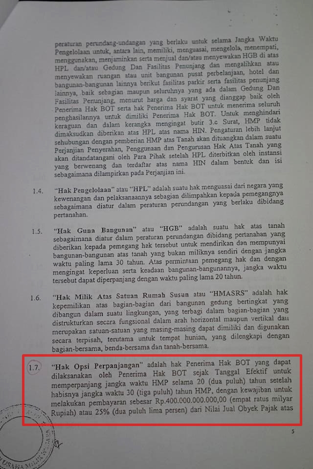 Dalam kontrak BOT tertera, PT GI bisa melaksanakan Hak Opsi untuk memperpanjang jangka waktu kerjasama selama 20 tahun sejak tanggal ditandatanganinya Perjanjian BOT. Dalam kontrak, sebetulnya BOT berakhir pada 12 Oktober 2035. Lalu pada 2010 disepakati hak BOT diperpanjang 20 tahun dan berakhir pada 12 Oktober 2055. Dalam pasal 7.1.1 dinyatakan Hak Opsi Perpanjangan dapat dilaksanakan sejak tanggal efektif tetapi tidak boleh lebih lambat dari 2 tahun sebelum berakhirnya jangka waktu 30 tahun HGB atas HPL. Artinya, opsi perpanjangan bisa dilakukan sewaktu-waktu.