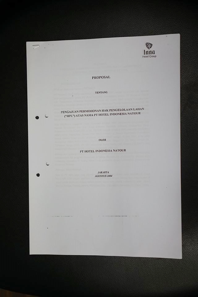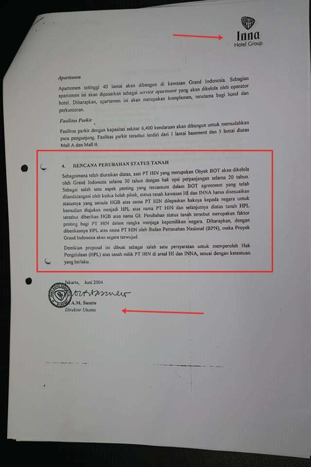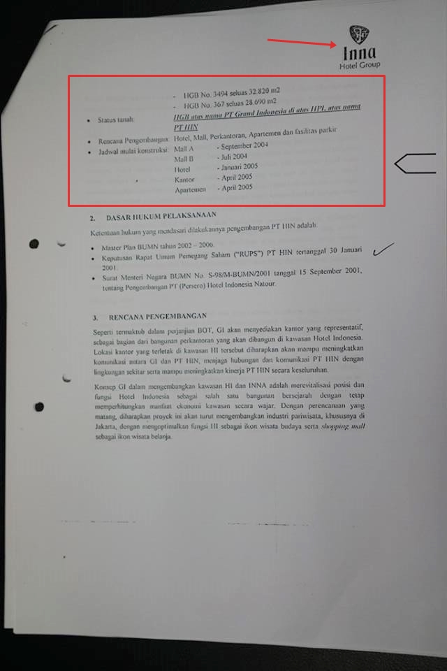 Ada fakta menarik yang saya temukan. Ternyata dalam proposal itu, pihak HIN sudah mengetahui rencana GI akan membangun gedung perkantoran dan apartemen pada April 2005. Dalam proposal dengan kop surat Inna Hotel Group itu, tertera jadwal konstruksi Mall A (September 2004), Mall B (Juli 2004), Hotel (Januari 2005), Kantor (April 2005) dan Apartemen (April 2005).