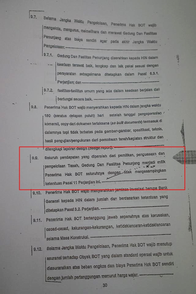 Berdasarkan pasal 9.9 tersebut pendapatan pengelolaan tanah, gedung dan fasilitas penunjang adalah hak GI seluruhnya dan GI konsisten dengan prinsip ini. Maka oleh karenanya GI tidak diwajibkan untuk menyerahkan laporan pendapatan maupun laba rugi dari pengoperasian obyek gedung dan fasilitas penunjang kepada HIN. Apalagi, BOT mensyaratkan, seluruh keuntungan dari pengelolaan aset yang dibangun adalah HAK dari PT GI, bukan HIN.