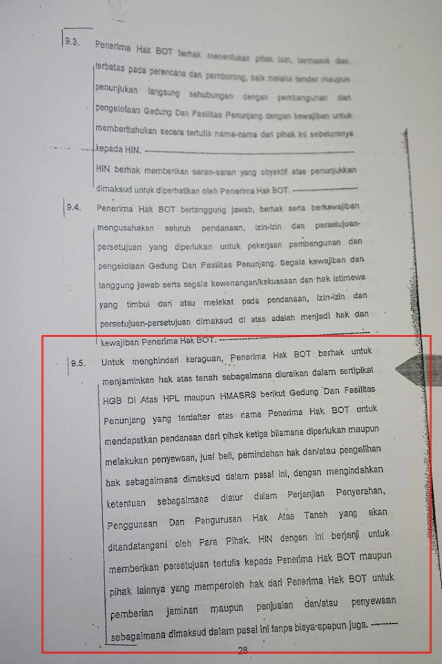 Dari pasal itupun sudah jelas kalau yang dapat dijaminkan HANYA HGB atas nama GI. Sementara sertifikat HPL tanah atas nama HIN tidak pernah dijaminkan karena dipegang oleh HIN.
