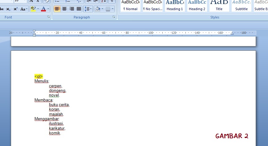 Ketik tag pembuka (<ol>) di atas baris pertama, lihat gambar 2. Tag pembuka ini aktif untuk daftar tingkat pertama.