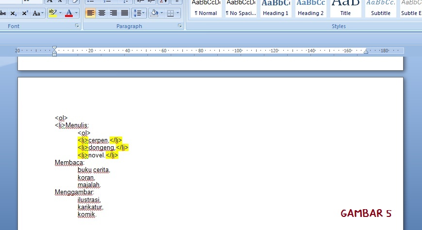 Ketik tag pembuka (<li>) di depan kata pertama pada tiap baris tulisan tingkat kedua, sekaligus ketik tag penutupnya (</li>), lihat gambar 5.