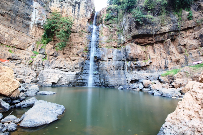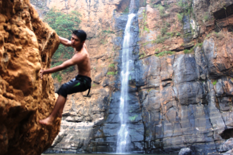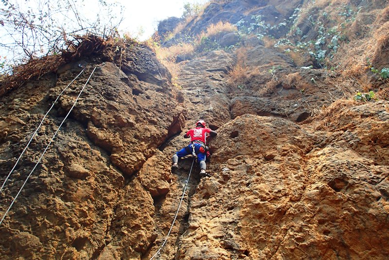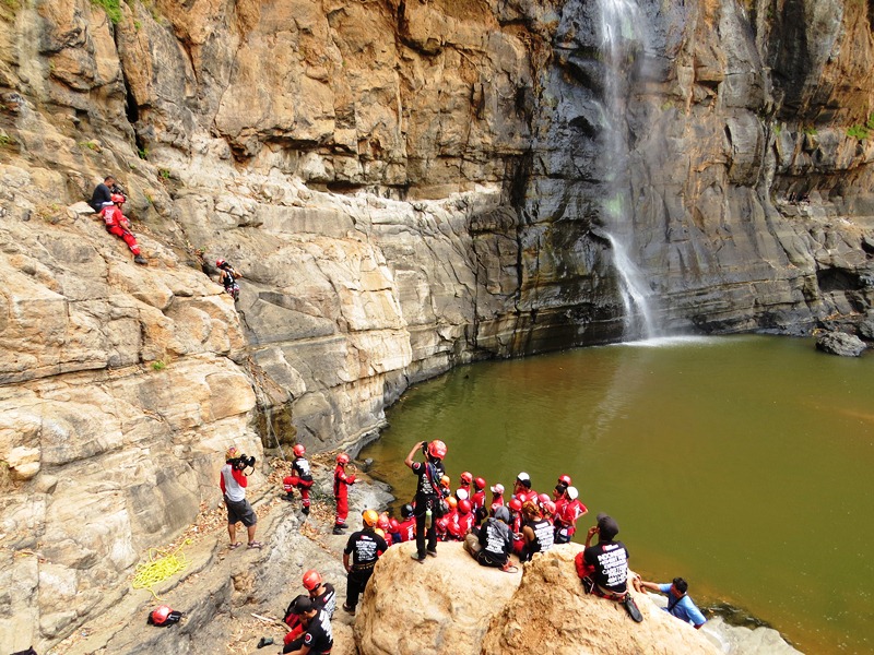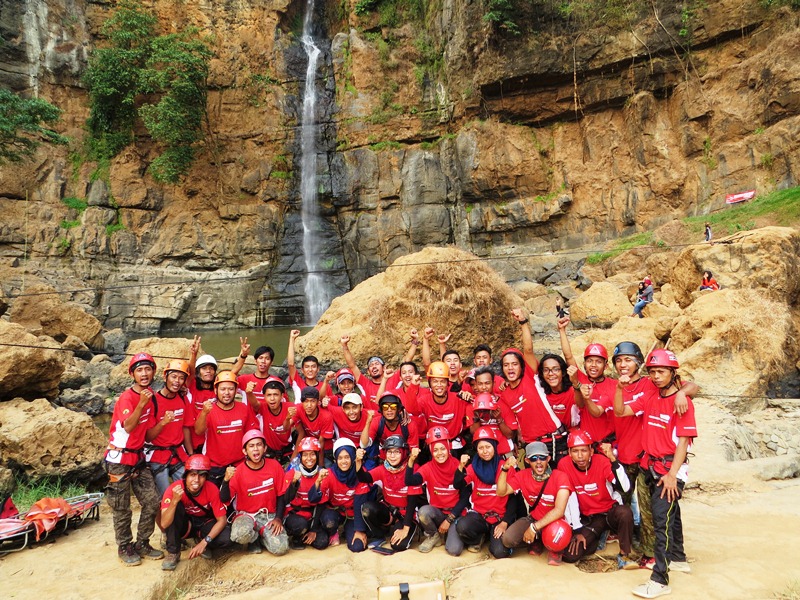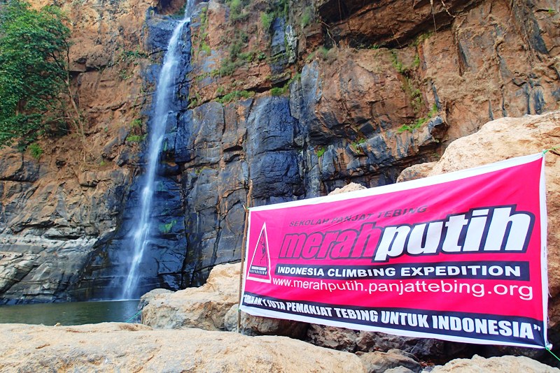 Tangan sudah gemetar mencengkeram lekukan tebing, demikian juga dengan kaki yang hanya bertumpu pada cekungan tebing yang lain. Suara rekan-rekan yang memberiku semangat ditambah suara gemuruh air terjun seperti membakar semangatku. Dengan sekuat tenaga aku mencoba mendorong badan dengan ujung kaki sambil berteriak “pull (tarik)” untuk meraih salah satu runner dan mengaitkan tali yang aku bawa dan berhasil. Meski dengan penuh perjuangan akhirnya aku bisa mencapai puncak jalur yang sudah disiapkan untuk latihan panjat hari itu. Sesaat setelah mengaitkan tali di runner terakhir, aku menyempatkan diri untuk melihat pemandangan dari atas.