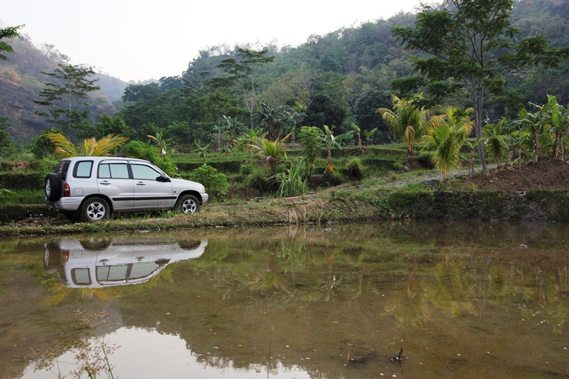 Mau bertanya ke penduduk desa tapi tak ada orang ataupun rumah. Aku berpikiran untuk kembali ke desa terakhir dimana masih terdapat listrik namun seingatku sudah cukup jauh. Namun mengingat kondisi jalannya dan hari semakin gelap…Arghhhh lengkap sudah penderitaanku.. Akhirnya aku memutuskan untuk melanjutkan perjalanan mengandalkan insting dan perasaan. Semoga secepatnya bisa menemukan rumah yang ada listriknya dan aku bisa menumpang charge handphone. Dalam kegelapan malam, aku merasa seperti berada di ‘in the middle of nowhere’.