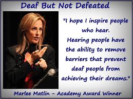 Kalau membicarakan orang tuli, maka satu orang yang muncul di benak penulis. Dialah Marlee Matlin. Beliau adalah orang tuli pertama yang mendapatkan piala Academy Award atau Oscar. Beliau adalah orang tuli yang membuka mata dunia bahwa seorang tuli bisa berprestasi dan berkilau. Dan Marlee Matlin lalu menjadi seorang inspirator, baik bagi orang tuli maupun bagi orang hearing – yang bisa mendengar, seperti kita-kita ini. Silakan googling dengan kata kunci “Marlee Matlin quotes”.