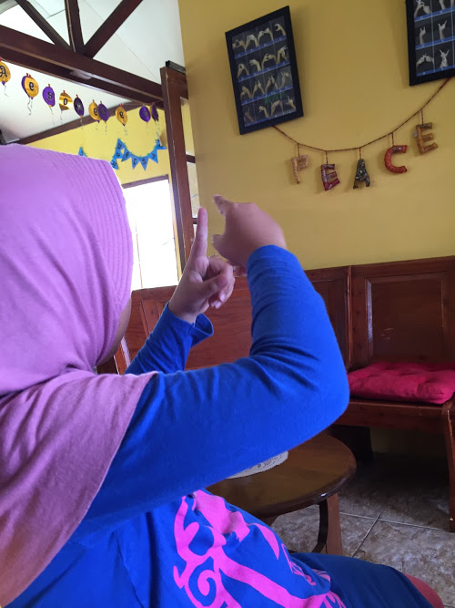 Yang menyenangkan dan mengasyikan untuk diperhatikan adalah saat si Ade mengeksplore sesuatu hal yang baru. Itulah saat dia melihat pigura dengan simbol alphabet bahasa isyarat, dia langsung mempraktekannya. Lucu sekali melihat tangan-tangan mungilnya berusaha membentuk suatu isyarat, diikuti mulut dengan pipi tembemnya membentuk suatu huruf.