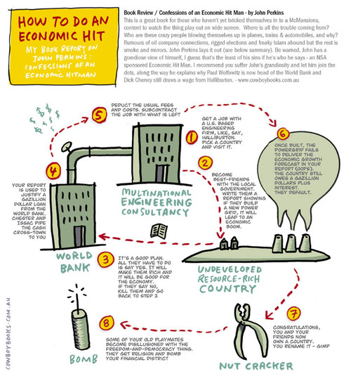 Dalam buku tersebut, si penulis (John Perkins) mengaku bahwa dirinya pernah bekerja sebagai - menurut istilahnya - Economic Hitman alias Bandit Ekonomi. Â Tugas bandit ekonomi ini adalah memuluskan upaya penguasaan sumber daya alam di suatu negara agar beralih ke tangan negara tempat para bandit ekonomi tersebut bekerja - dalam hal ini Amerika Serikat, atau lebih tepatnya ke tangan para pemilik perusahaan multinasional.