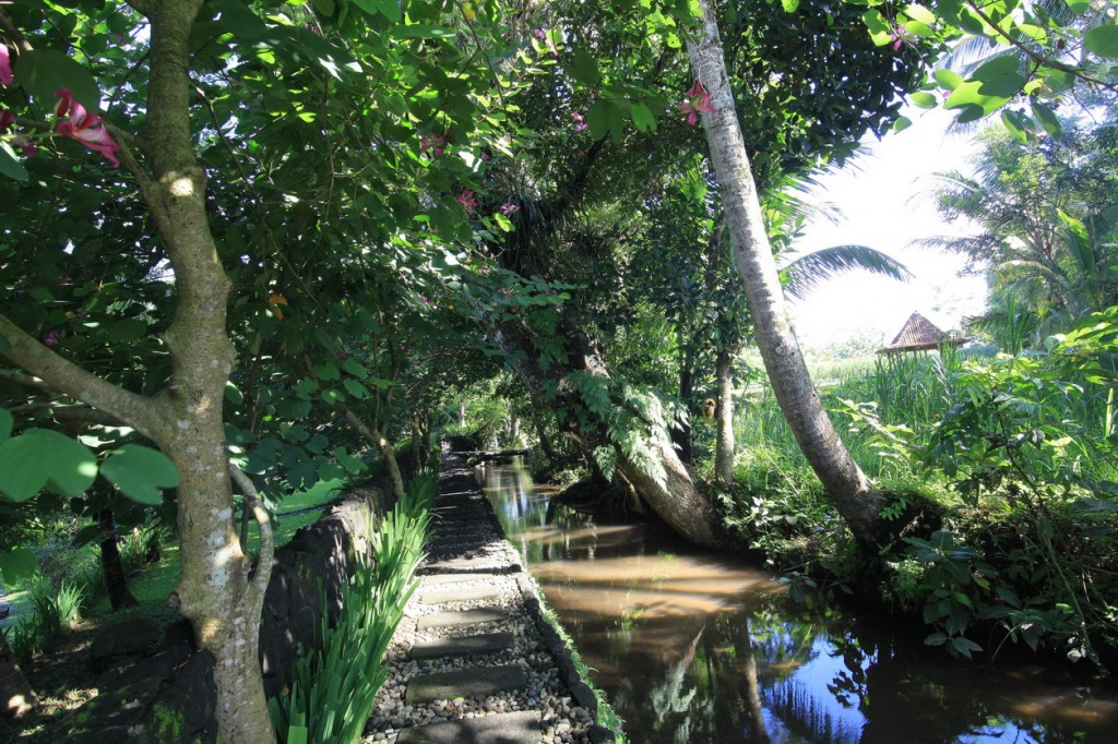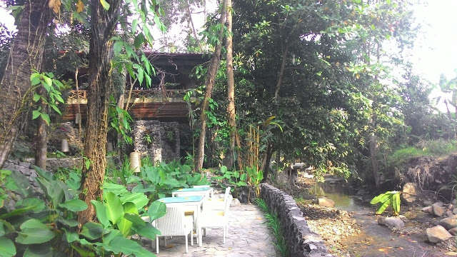 Saya berjalan menuruni area di bawah, ada kali yang dibiarkan tetap mengalir. Pengunjung bisa menikmati santap siang sembari mendengar gemericik air mengalir dan persawahan di sebelahnya. Resort ini memang di kelilingi sebuah sungai kecil yang mengalir dari kaki gunung Merapi. Beberapa tamu yang menginap disini, mengajak anak mereka untuk bermain di kali, jika di kota hal tersebut susah ditemui, disini pengunjung bisa mengenalkan alam pada anak-anak mereka.