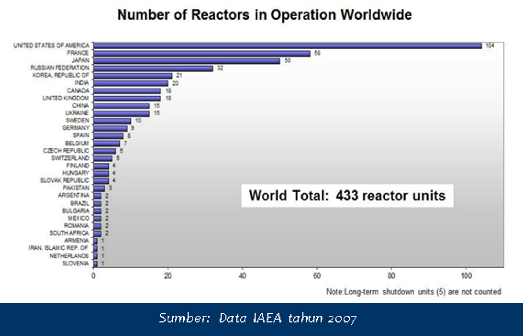 Arsip International Atomic Energy Agency (IAEA) menunjukkan bahwa pada tahun 2007 terdapat 433 unit pembangkit listrik tenaga nuklir (PLTN) di seluruh dunia. Pada saat itu dan bertahan hingga sekarang, Amerika Serikat masih menjadi operator terbesar PLTN dengan jumlah reaktor 104 unit.