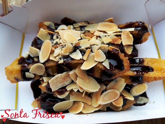 Lihat bentuknya panjang dan bergerigi. Biasanya rasa kayu manisnya begitu kentara. Di atasnya dituangkan lelehan cokelat cair dan diberi beberapa potong kacang kenari bakar. Jika ingin mencobanya, Chusy Churros telah hadir di JSFF. Anda akan mendapatkan satu porsi churros dengan harga 25K.