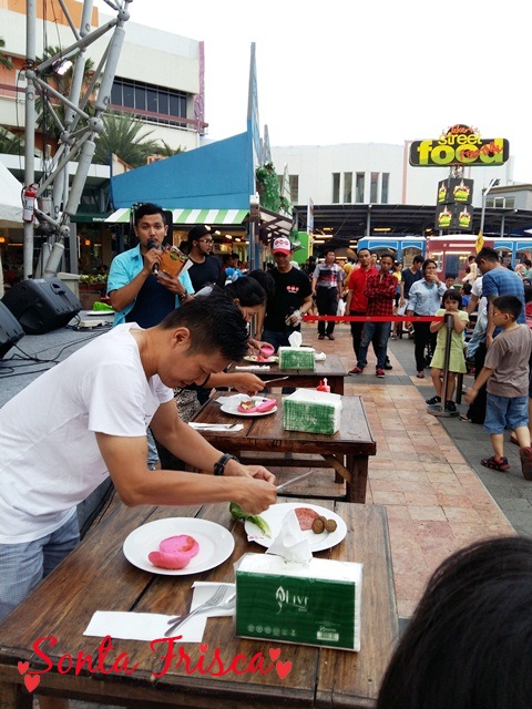 Selain memanjakan lidah para pengunjungnya, JSFF juga menghadikan berbagai event. Salah satunya adalah makan duren sepuasnya. Bagi Anda pecinta durian Anda dapat makan buah-buahan ini sampai perut Anda kenyang. Perlu dicatat, acara ini dilaksanakan setiap Senin dan Rabu. Bagaimana caranya agar Anda dapat mengikutinya? Jika Anda membeli Jakarta Street Food Festival Card senilai 250K berlaku kelipatan, Anda akan mendapatkan satu kupon Makan Duren Sepuasnya hanya dengan membayar 10K. Setiap harinya peserta hanya dibatasi sampai 10 orang. Jadi, saya sarankan sesampainya di La Piazza, langsung top up dan daftarkan diri sebagai salah satu peserta peserta makan duren sepuasnya. First come, first serve.